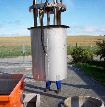 为了清空收集篮,要解开压力软管,用提升装置将篮子完全从池子里拉出来,砂砾和碎片保留在篮子里,残留水通过收集篮的底部排出。将篮子清空倒入垃圾箱或直接倒入垃圾车。拉动中间的解锁杆就可以将栅格折叠而打开,砂砾会从底部落下。篮子清空以后,旋转栅格,将篮子放回池子里。等重新接上对压力耦合,砂砾收集器可以准备工作了。