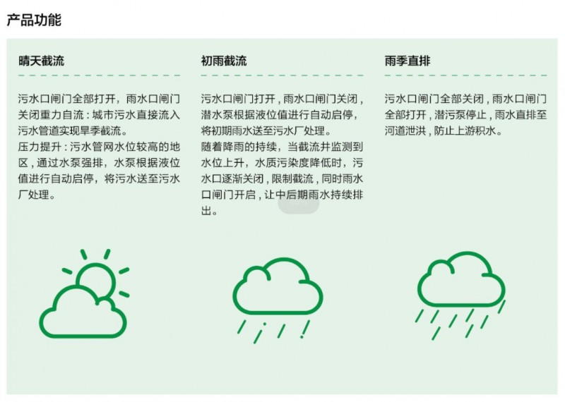 针对目前合流制管道污水直排,分流制管道中存在混接污水,初期雨水溢流污染导致河道水体黑臭的问题,海辰开发了一体化智慧截流提升井。通过在线监控系统,将晴天污水与初期雨水截流至污水管网中,后期雨水分流至雨水管网或河道中,实现“晴天截流,初雨截流,雨季直排”的功能。一体化智慧截流提升井能够完成截污纳管的工作,在解决城市黑臭水体问题方面起到突出的作用。